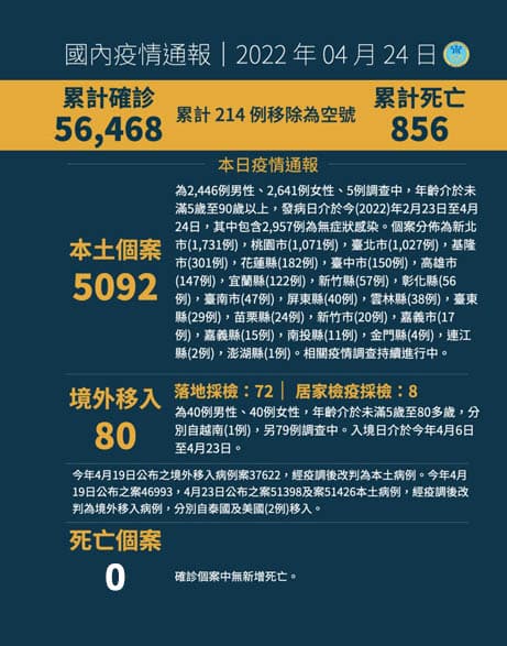 指揮中心表示,4月24日新增5,092例本土病例,為2,446例男性、2,641例女性、5例調查中,年齡介於未滿5歲至90歲以上,發病日介於今2022年2月23日至4月24日,其中包含2,957例為無症狀感染。個案分佈為新北市(1,731例),桃園市(1,071例),臺北市(1,027例),基隆市(301例),花蓮縣(182例),臺中市(150例),高雄市(147例),宜蘭縣(122例),新竹縣(57例),彰化縣(56例),臺南市(47例),屏東縣(40例),雲林縣(38例),臺東縣(29例),苗栗縣(24例),新竹市(20例),嘉義市(17例),嘉義縣(15例),南投縣(11例),金門縣(4例),連江縣(2例),澎湖縣(1例)。相關疫情調查持續進行中。