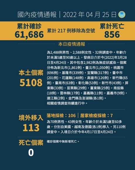 指揮中心表示,4月25日新增5,108例本土病例,為2,488例男性、2,588例女性、32例調查中,年齡介於未滿5歲至90歲以上,發病日介於今2022年3月28日至4月24日,其中包含2,982例為無症狀感染。個案分佈為新北市(1,861例),臺北市(1,050例),桃園市(696例),基隆市(339例),宜蘭縣(317例),臺中市(201例),花蓮縣(148例),高雄市(126例),新竹縣(65例),臺南市(63例),彰化縣(53例),新竹市(43例),屏東縣(33例),苗栗縣(29例),臺東縣(25例),南投縣(18例),雲林縣(17例),嘉義縣(11例),嘉義市(9例),連江縣(2例),金門縣及澎湖縣(各1例)。相關疫情調查持續進行中。