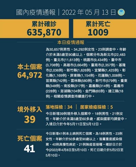 5月13日新增41例本土病例死亡個案,為18例男性、23例女性,年齡介於50多歲至90歲以上,皆屬重度感染個案、40例具慢性病史、21例無疫苗接種。確診日介於今(2022)年4月8日至5月10日,死亡日期介於5月2日至5月10日。