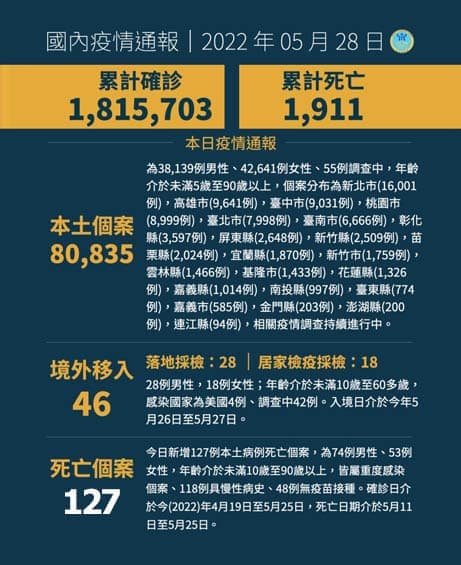 5月28日新增127例本土病例死亡個案,為74例男性、53例女性,年齡介於未滿10歲至90歲以上,皆屬重度感染個案、118例具慢性病史、48例無疫苗接種、80例疫苗接種。確診日介於今2022年4月19日至5月25日,死亡日期介於5月11日至5月25日。