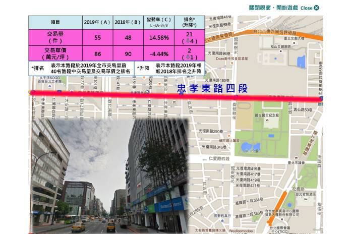 地政局表示,針對2019年實價登錄的買賣案例,以屋齡5年為界劃分新成及中古屋,分別統計交易量前40名的熱門路街,並以平均交易單價排序,除各路段交易量及單價,同時呈現較2018年的變動幅度與排名升降,市民可輕鬆讀懂北市熱門交易路段及其近1年量價變化,其中新成屋房價和平東路一段最高、中古屋房價仁愛路四段居冠。