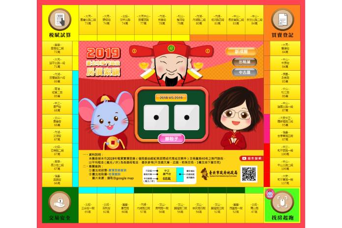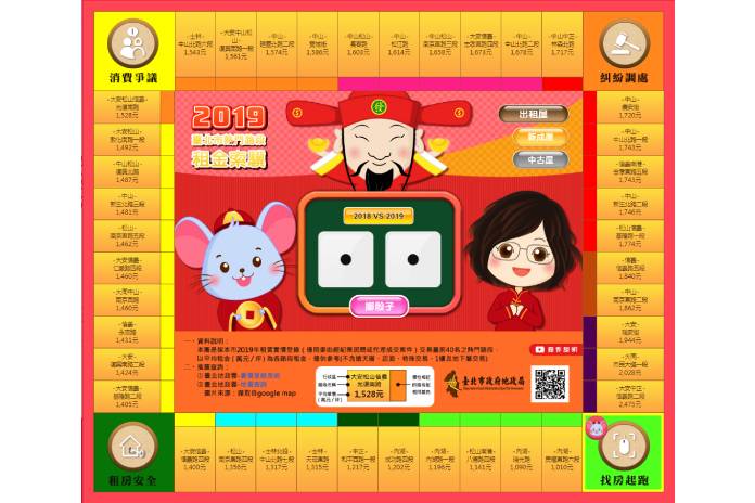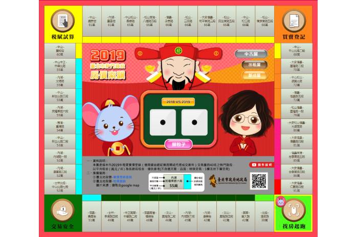 歲末年終,台北市政府地政局再度以前一年度實價登陸案例,整理出不動產買賣及租賃交易量前40名的熱門路段,運用大富翁桌遊型式,推出「2019台北市熱門路段房價&租金索驥」買房版-新屋版、中古屋,及租房版-出租屋三種版型,並延續台北找房SOP的概念將買租交易相關資訊、應注意事項串聯於遊戲圖版的4個ICON中,同時納入地政局近1年房市買租交易新資訊,如實價資訊門牌區間縮小為10號、社區交易履歷棟棟都可查等,讓市民新春團圓玩桌遊,輕鬆攻略北市熱門路段房價、租金行情及不動產交易大小事。