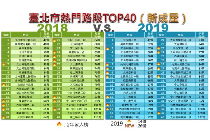地政局表示,為方便市民比較買租熱門路段近2年分布及變化,特別製作台北市熱門路段TOP40「2018 VS 2019」比較表,讓近2年熱門交易路段變動一目了然。經綜合比較發現2019年新成屋熱門路段中,共有26個路段為新進榜;中古屋及出租屋熱門路段變動相對穩定,2019年分別有33個及35個路段連2年上榜,新進榜路段則較少。