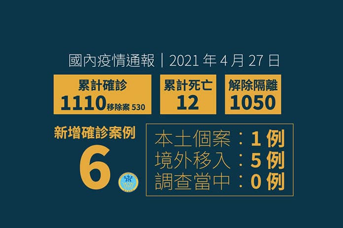 臺灣中央流行疫情指揮中心4月27日公布新增5例境外移入COVID-19病例,自加拿大(案1106)及菲律賓(案1107至案1110)入境。另外新增1例本土COVID-19確診病例(案1111),為澳洲驗出陽性機師及案1090之同住家人。