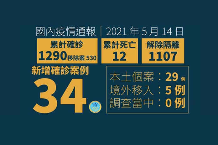 *臺灣中央流行疫情指揮中心5月14日公布新增5例境外移入 COVID-19確定病例,另外新增29例本土COVID-19確定病例,總計34例。