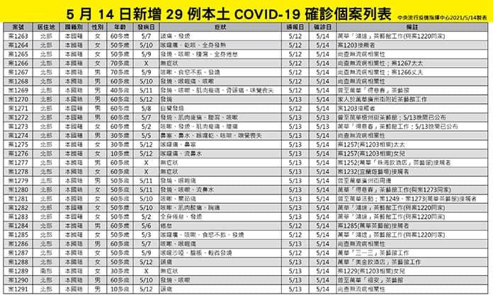 有關5月14日新增29例本土COVID-19確定病例,請參閱縮圖。指揮中心表示,初步調查新增個案與先前確診個案之流病相關性,其中16例與臺北市萬華區茶藝館及周邊相關;5例與案1203及其相關個案有關;1例與宜蘭遊藝場個案相關;7例尚查無相關性。