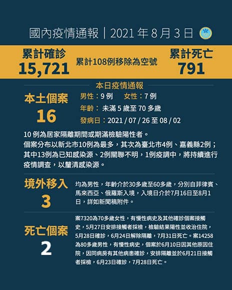 8月3日新增之16例本土病例(其中10例為居家隔離期間或期滿檢驗陽性者),為9例男性、7例女性,年齡介於未滿5歲至70多歲,發病日介於今2021年7月26日至8月2日。個案分布以新北市10例為最多,其次為臺北市4例、嘉義縣2例;其中13例為已知感染源、2例關聯不明,1例疫調中,將持續進行疫情調查,以釐清感染源。