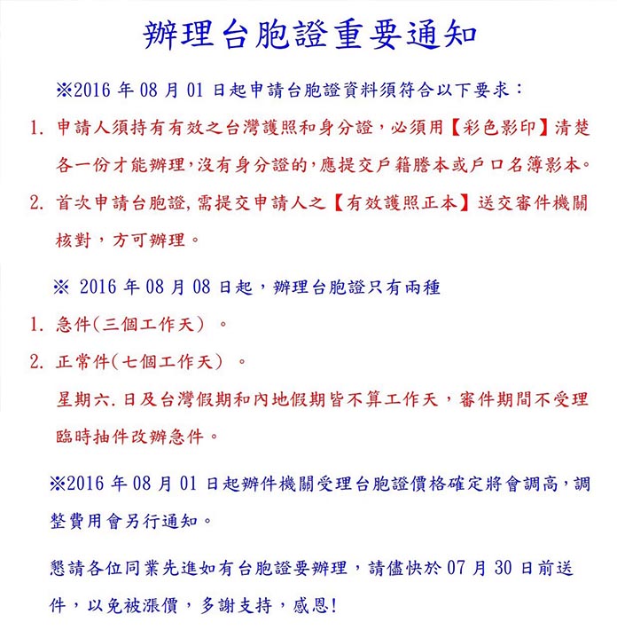 值得一提的是,該通知指出,8月8日起,辦理台胞證只有兩種,急件3個工作天與正常件7個工作天,周六、日及臺灣假期與內地假期階不算工作天。對於計畫赴大陸旅遊及一般商務人士來說,申請時間上較以往明顯出現大限縮。