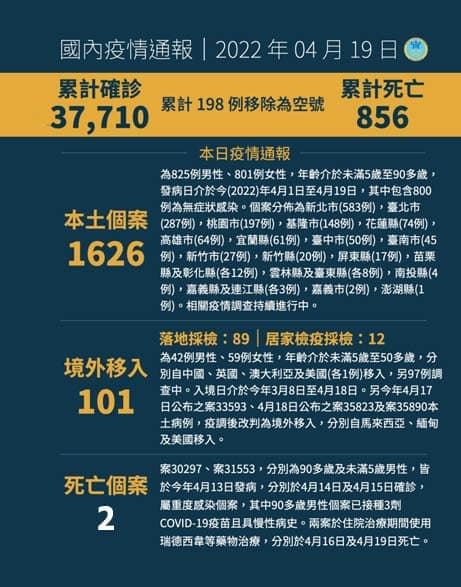 指揮中心表示,4月19日新增1,626例本土病例,為825例男性、801例女性,年齡介於未滿5歲至90多歲,發病日介於今2022年4月1日至4月19日,其中包含800例為無症狀感染。個案分佈為新北市(583例),臺北市(287例),桃園市(197例),基隆市(148例),花蓮縣(74例),高雄市(64例),宜蘭縣(61例),臺中市(50例),臺南市(45例),新竹市(27例),新竹縣(20例),屏東縣(17例),苗栗縣及彰化縣(各12例),雲林縣及臺東縣(各8例),南投縣(4例),嘉義縣及連江縣(各3例),嘉義市(2例),澎湖縣(1例)。相關疫情調查持續進行中。