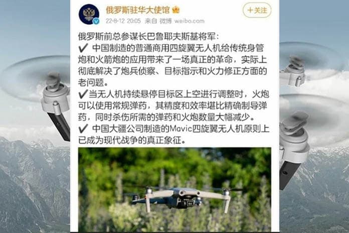 該帖引述俄羅斯前總參謀長尤里-巴盧耶夫斯基Yuri Baluyevsky將軍的新書內容指出:大疆無人機給傳統火炮的應用,帶來一場真正的革命,徹底解決偵查,目標指示和火力修正問題。其精度和效率堪比精確導彈。該將軍盛讚中國大疆公司製造的「Mavic四軸無人機,已成為現代戰爭的真正象徵」。
