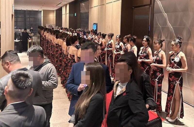 據悉,明仁會當晚在萬豪酒店席開85桌,將近上千人到場參與,其中更有170名旗袍辣妹被安排站在一樓大廳,宛如星光大道,場面可以說相當盛大。