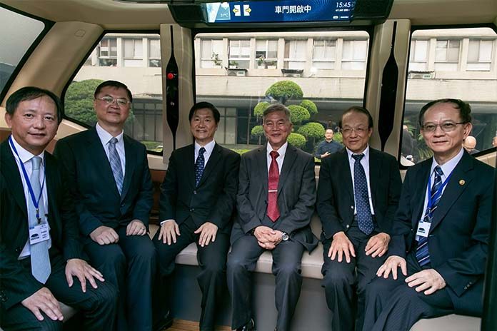 WinBus在經濟部中庭完成自動駕駛繞行,並由經濟部長沈榮津與產業貴賓車內見證。