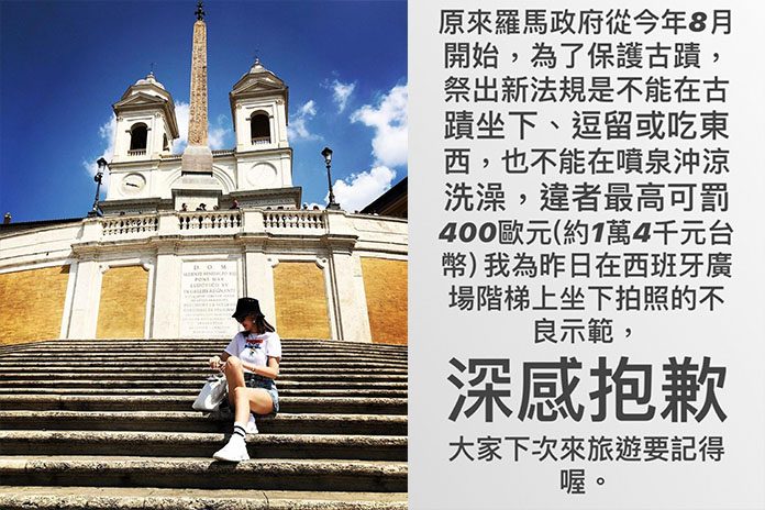 然而,陳若儀曬出照片後,卻引來網友留言指正“這裡禁止坐著”。事實上,早在8月開始,羅馬政府新規上路,包括歷史古跡前不准露營、不准坐下,禁止在噴泉中洗澡,旅客也不可在此處使用折疊椅或拖著有輪子的行李廂,違者最高可被罰400歐元罰款,而熱門景點西班牙階梯更是警方執法的重點之一。