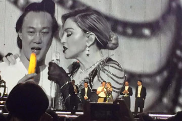 丹娜昨晚首次親臨澳門舉行演唱會,帶同了太太徐濠縈及女兒到場的陳奕迅(Eason)則成為當晚幸運兒,獲邀上台和娜姐共舞,掀起全晚高潮,Eason全程表演興奮又落力地跳舞,氹得娜姐非常開心,最後一如過去幾場的演唱會一樣,Eason獲娜姐送上香蕉作為獎品,更大講有味笑話。1456079529432885