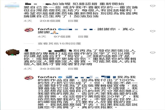 面對酸民惡意的質問與諷刺─「別再為了發你那張沒人要聽的專輯打這些做作的文字了可以嗎」;藝人范范親自機智回文: 「我並不是一定要發行或為了這張專輯做宣傳,就算最後它沒有發行,我並不遺憾。」