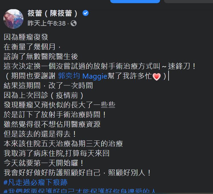 陳筱蕾於2018年底發現自己罹患了腦瘤,診斷出腦部有顆4公分大的腫瘤,不緊因因腦瘤術後導致面癱,還要休養調適身體,所以工作也因此停擺。近期因腫瘤復發,陳筱蕾昨(15)日在臉書發文表示自己因為不想在疫情當下占用醫療資源,將採用每天來回醫院的方式做手術療程。