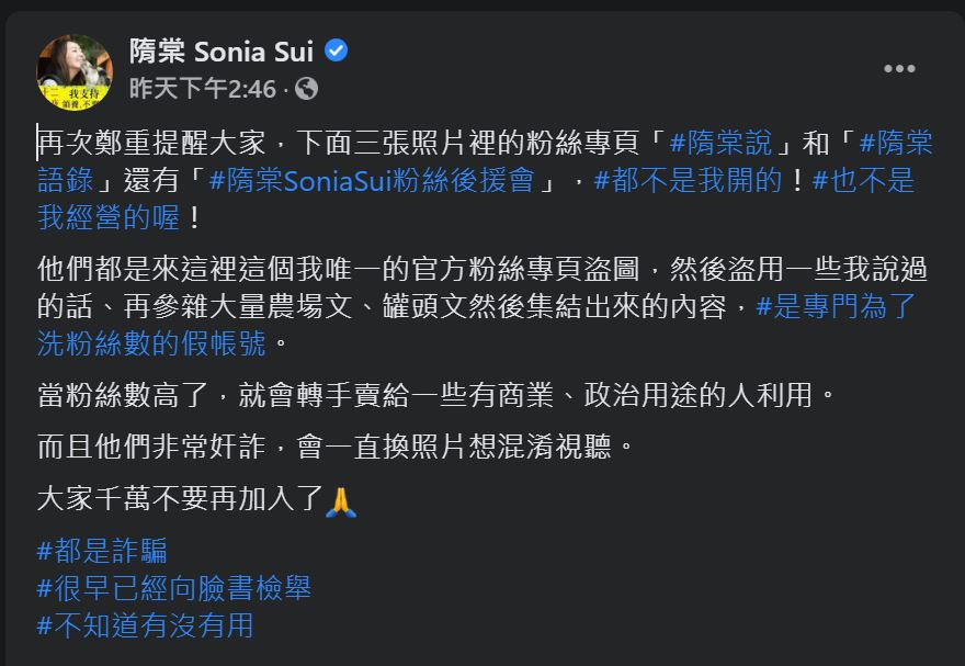 著網路的發達,以及社群平台的流行,詐騙也開始滲透進來,而且變得越來越多樣化;近日女星隋棠即表示自己已被盜用身份的粉專以她的名義經營社群粉絲,希望網友多加留意,不要再加入這些盜用她身份的粉絲團而助長了歪風。