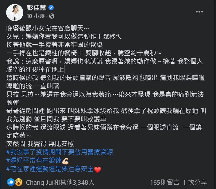 儘管她說自己當時「聽到我的骨頭撞擊的聲音 尿液隱約也噴出 痛到我眼淚嘩啦嘩啦的流 一直叫著貝拉 貝拉~她還在我旁邊以為我裝痛 ⋯後來才發現 我是真的痛到無法動彈」但幸好事後並無大礙,彭佳慧也表示自己我沒事了,更說自己在疫情期間不要佔用醫療資源,並呼籲大家宅在家裡運動還是要注意安全。