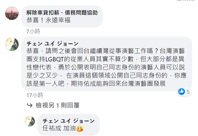 任祐成不僅演過BL劇,也曾以「愛玩客」的外景節目擔任主持;,26日透過直播宣告自己出櫃,並已與男友在去年於美國登記結婚,等之後疫情穩定會再返台登記;而雙方更是有如「著魔」般地熱戀著,儘管兩人談著遠距離的戀愛,雙方也不時會台、日兩地飛;並宣佈,自己的想法「我要用自己小小的力量,讓更多人知道不同的愛,讓LGBT傳遞更多的愛。」