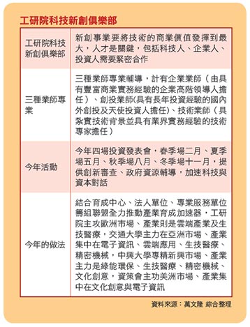 工研院至今已技轉衍生新創事業八十四家,成功上市櫃十八家,工研院科技新創俱樂部將加速新創、加速投資、加速轉型,工研院產業服務中心新創事業組長徐竹先指出,新創事業要將技術的商業價值發揮到最大,人才是關鍵,包括科技人、企業人、投資人需要緊密合作,俱樂部提供三種業師專業輔導,計有企業業師(由具有豐富商業實務經驗的企業高階領導人擔任)、創投業師(具有長年投資經驗的國內外創投及天使投資人擔任)、技術業師(具紮實技術背景並具有業界實務經驗的技術專家擔任)等,豐富事業的人力資源,引導企業成功。