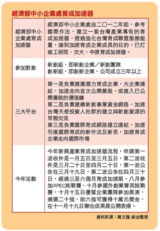 此外,經濟部中小企業處自前年(二○一二)起,參考國際作法,建立一套台灣產業專有的育成加速器,透過強化台灣育成聯盟服務能量,達到加速育成企業成長的目的,已打造工研院、交大、中原育成加速器。