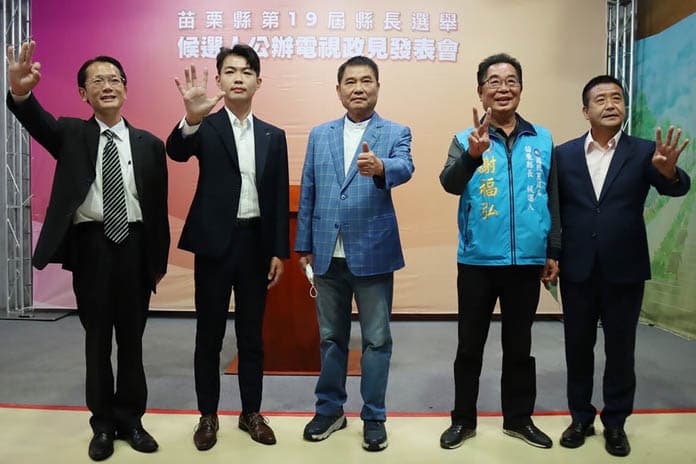 苗栗縣第19屆縣長選舉候選人第二場公辦電視政見發表會11月21日上午舉行,徐定禎、宋國鼎、國民黨謝福弘、無黨籍鍾東錦與吳盛聖等5名候選人都出席。