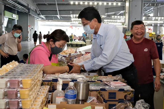 *九合一選舉投票日逼近,國民黨臺南市長候選人謝龍介(前右)11月23日前往新化果菜市場拜票衝刺選情,近距離與民眾及攤商互動,爭取支持。(圖片謝龍介競選總部提供)