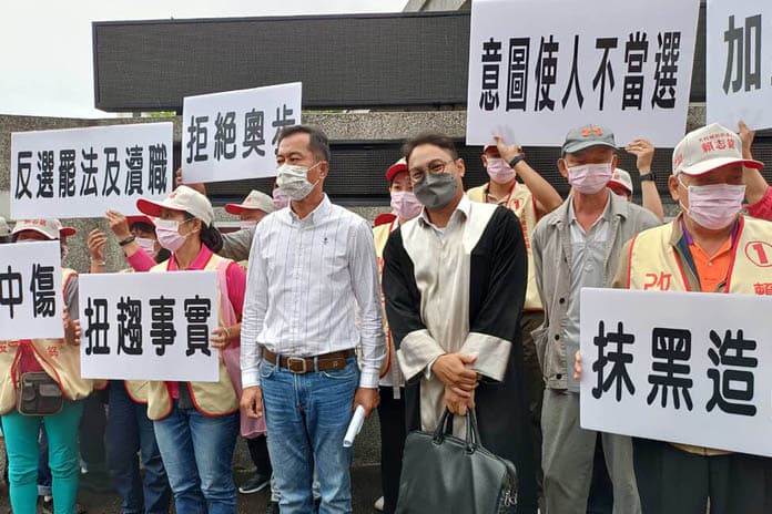 彰化大村鄉長候選人賴志銘11月23日按鈴控告鄉長游盛。賴志銘指出,游盛安排婦人手拿丈夫遺照進場聆聽政見會影響他發言,還將他攔下說要給婦人交代,游盛行為已違反選罷法。