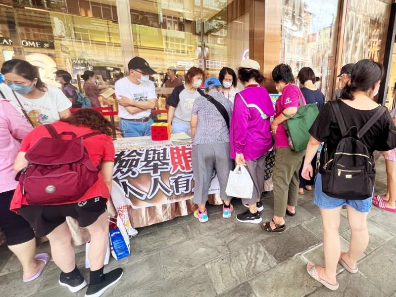 ▲台水三區處及竹市文化局政風單位再次聯手主動出擊透過寓教於樂大力宣傳「全民反賄.淨化選風」,吸引週末逛街人潮排隊熱情參加活動。