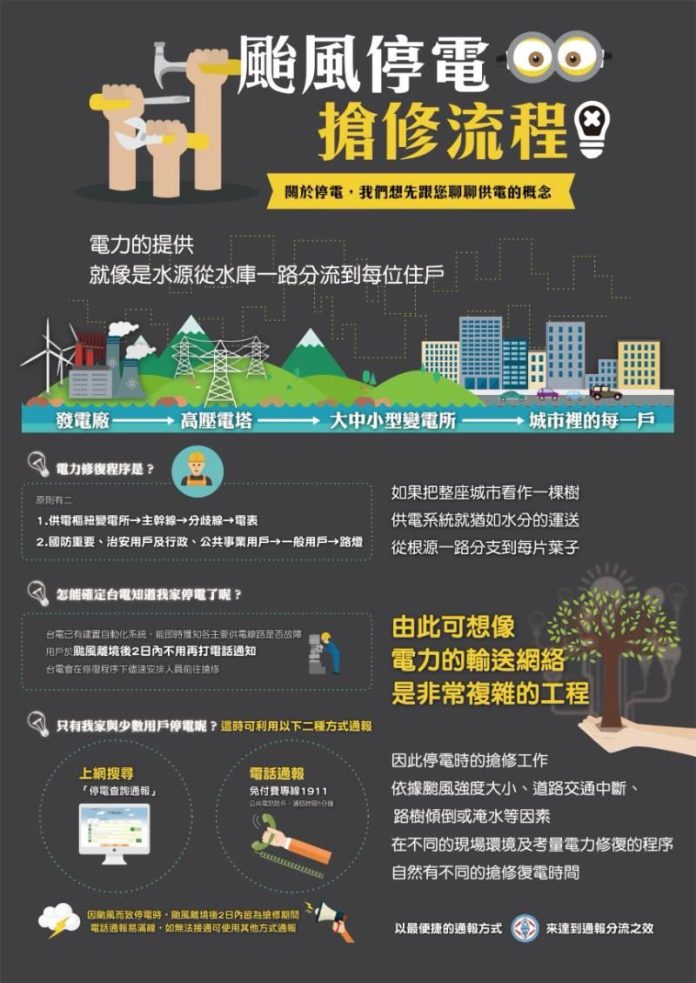 針對颱風造成的停電事故,台電將積極搶修儘快復電,復電程序將採「供電樞紐變電所→主幹線→分歧線」的原則來進行,並以先火車、自來水及電話通信等公用設施,然後一般用戶的順序,安排人員搶修,不過搶修進度仍會受到停電範圍、交通路況、風雨情況等影響,請遇到停電狀況的民眾多多體諒。