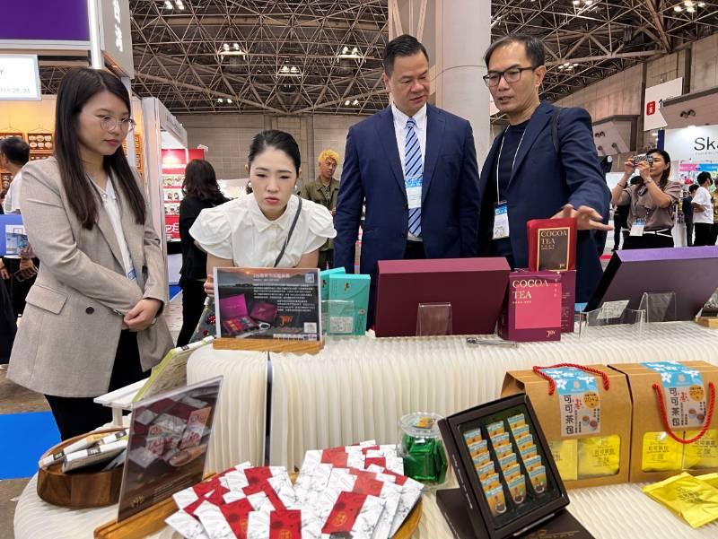 貿協東京台貿中心主任鄧之誠到場參觀大讚「屏東的商品真的很有創意、很棒」!大阪「CEMENT PRODUCE DESIGN」設計公司社長金谷勉品嚐芒果酒及蓮霧果乾,以中文驚呼「非常好吃」!