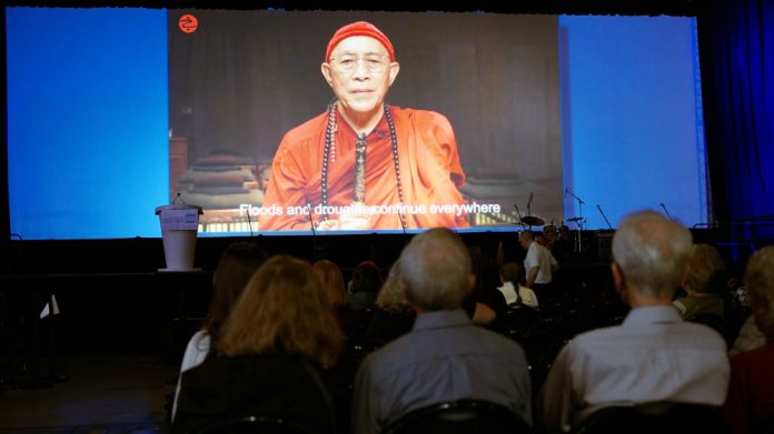 ▲世界宗教博物館創辦人心道法師透過影片於氣候行動論壇呼籲大眾找回靈性,共同覺醒,才能解決生態與人類永續問題。(圖/靈鷲山佛教教團提供)