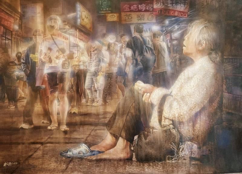 許文昌表示,這件得獎作品是「行乞者」系列今年第二件得獎作品之一,創作理念顯示了對於藝術的深刻思考和對社會議題的敏感度。「行乞者」系列作品呈現了一個有力的訊息,關注社會中被忽略和需要幫助的人們,以及在現實生活中所面臨的困境和無奈。這種深刻的內容不僅讓觀眾反思生命的意義和人生旅程,也促使人們關注社會中的不平等和需要改善的問題。
