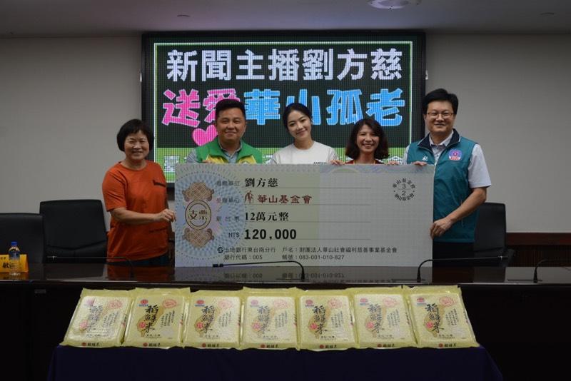 已退休台南地檢署潘敏捷書記官、台南李啟維市議員,串聯熱心人士,募集善款13萬6千元及2公斤裝白米2,520包,主播劉方慈慷慨捐助12萬,盼能拋磚引玉,四方傾力支持,華山基金會盼更多熱心民眾加入「愛老人」行列,照顧更多在地孤老。