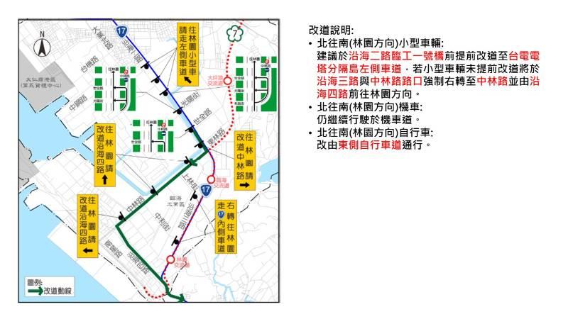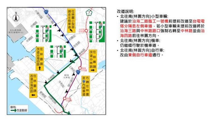 新工處表示,封閉期間南下機車道仍維持機車通行,請欲前往林園方向之小型車提前於沿海二路臨工1號橋前改道至台電電塔分隔島左側車道,若小型車輛未提前改道將於沿海三路與中林路路口強制右轉至中林路並由沿海四路前往林園方向。此次沿海三路南下西側汽慢車道及自行車道封閉資訊也同步協請警察廣播電台加強宣導,請用路人留意沿路各路口改道牌面及配合現場義交人員指揮,以確保工區周邊行車安全與順暢,施工不便之處,敬請各用路人體諒。