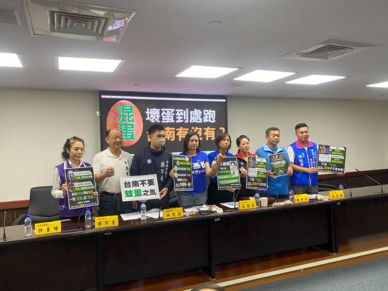 【勁報記者杜忠聰/臺南報導】針對近日農業部巴西過期進口蛋竟流入賣場通路事件,21日台南市議會國民黨團市議員王家貞、林燕祝、蔡宗豪、盧崑福、許至椿、李中岑共同召開記者會,請教育局主秘楊智雄、農業局畜產科長徐幸君、衛生局副局長黃文正、經發局市場處長陳豪吉、消保官張淑娟岀席,要向市政府各單位問清楚「混蛋、壞蛋」到處跑,台南到底有沒有?