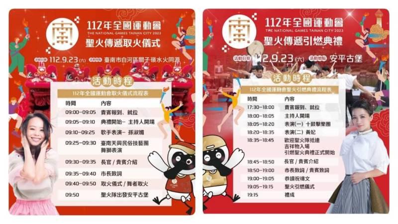 體育局長陳良乾表示,全運會睽違16年再度由臺南主辦,是全體臺南人盛事,這次特別用「古都四百年.全運競澎派」概念來傳達臺南人好客、熱情、溫暖特質,在取火、聖火引燃儀式上特別邀請金曲歌后孫淑媚、黃妃分別在關子嶺及安平古堡接續開唱,勢必將氣氛炒到最高點,歡迎民眾趁著週末呼朋引伴來逗鬧熱。(臺南市政府提供照片)