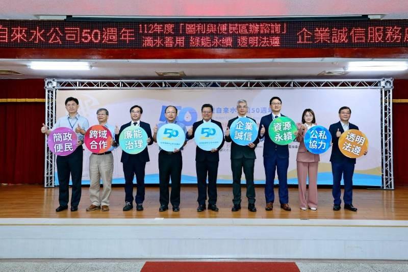 (勁報記者張亞痕/臺中報導)台灣自來水公司明年將邁入50週年,服務的戶數從草創時期的70萬戶至今已達到760萬戶,除了不斷提升供水質量,更著重工程品質與廉能,台水20日舉辦50週年系列活動之「圖利與便民之區辨-滴水善用 綠能永續 透明法遵」企業誠信服務座談會,與廉政單位、合作廠商交流,落實政府綠能政策、企業服務的廉政精神。