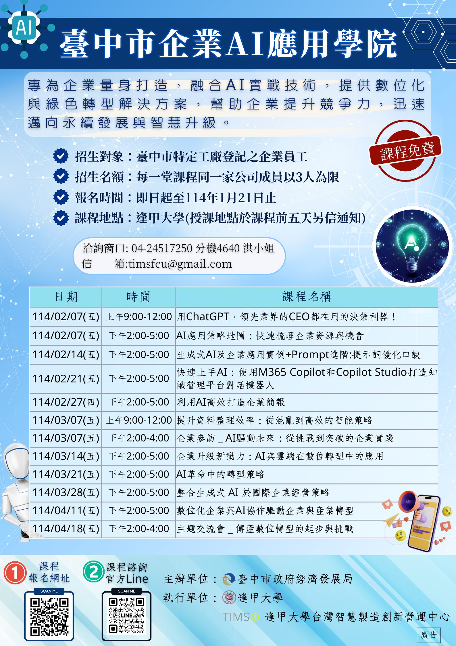 隨著人工智慧(AI)、物聯網(IoT)和自動化技術的興起,傳統工廠面臨全面轉型的壓力,為協助在地中小企業搭上AI浪潮,邁向升級轉型之路,台中市政府經濟發展局首度開辦「企業AI應用學院」,由逢甲大學集結多位產業界經驗豐富之業師,以AI實務應用與案例分析導向課程,促進工廠內部技術升級和管理創新。以台中市特定工廠登記之企業員工為開課對象,報名期限自即日起1月21日止,2月7日將正式開課,請正苦惱如何導入AI工具的業者不要錯過這個難得的機會!