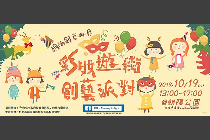 台北市朝陽服飾材料區發展協會於2019年10月18至19日舉辦「108朝陽創藝再生」活動,邀請民眾參與「彩妝遊街創藝派對」、「朝陽創藝手作DIY」及「迷路尋蹤喚麋鹿」等系列活動。
