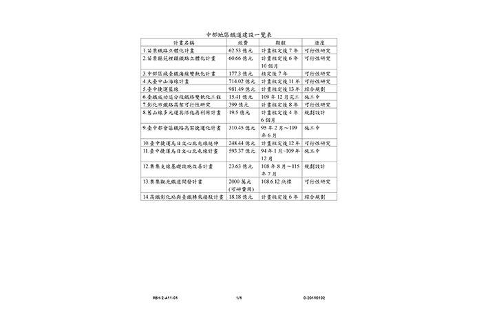 其他案包括苗栗鐵路立體化計畫,經費62.53億元;苗栗縣苑裡鎮鐵路立體化計畫,經費60.66億元;中部區域台鐵海線雙軌化計畫,經費177.3億元;大台中山海線計畫,經費714.02億元;彰化市鐵路高架可行性研究,經費399億元;舊山線多元運具活化再利用計畫,經費19.5億元;台中捷運烏日文心屯線延伸,經費248.44億元;集集支線基礎設施改善計畫,經費23.63億元;集集觀光鐵道開發計畫,可研究經費2000萬元;高鐵彰化站與台鐵轉乘接駁計畫,經費18.18億元等。