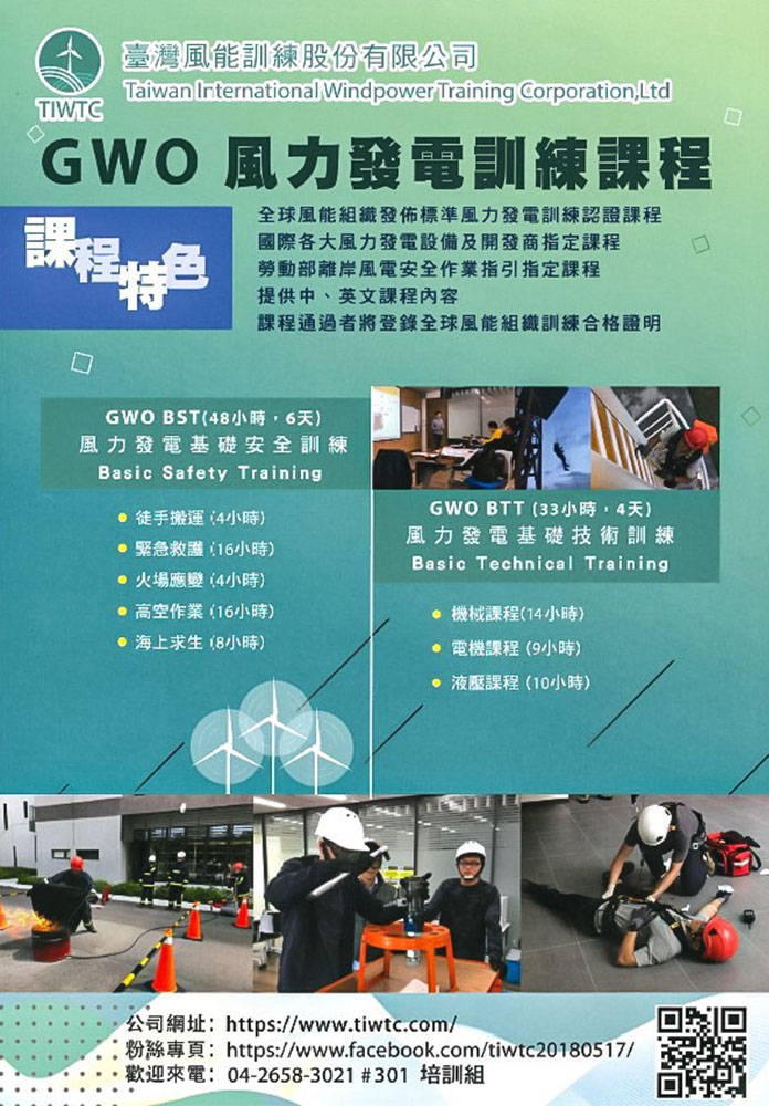 風訓公司已導入GWO基礎技術訓練(Basic Technical Training, BTT)與基礎安全訓練(Basic Safety Training, BST)雙項國際認證,並於臺中港區斥資新臺幣1.3億元,興建具國際標準的「臺灣風能訓練中心」,設置深達6米的深水訓練泳池,以及國內最高22米高空訓練塔,於108年9月揭牌營運,成為全臺唯一能夠同時進行BTT與BST授課的專業機構。