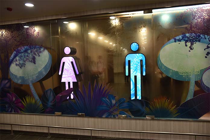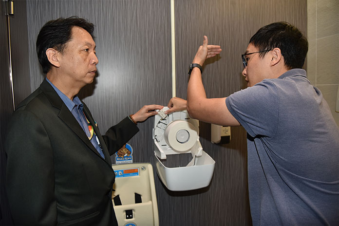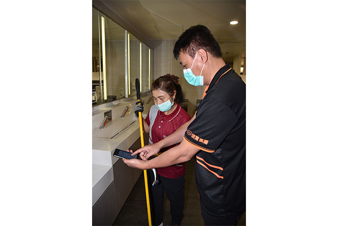 洗手間出入口天花板安裝人流感測元件,若大量人流進入就會發出通知,幹部可立即調派工作人員至現場加強清潔,加裝阿摩尼亞及硫化氫氣味偵測感應元件,以具體數據偵測空氣品質,確保洗手間內無異味。