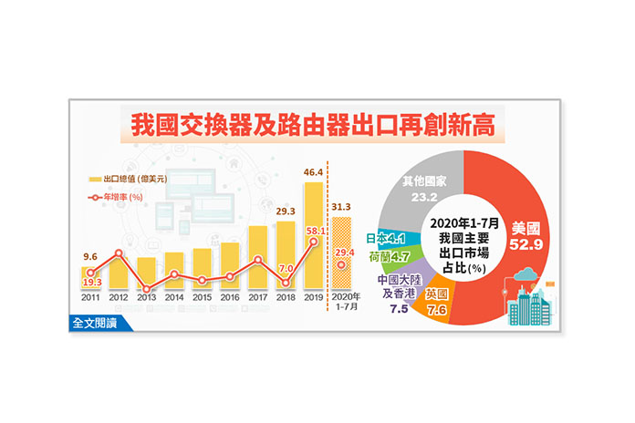 經濟部統計處說明,台灣交換器及路由器自2011年9.6億美元,一路攀升,至去年受美中貿易紛爭影響,促使台廠產線移回,加上轉單效應,出口金額耀增至46.4億美元創歷史新高,年增幅度達58.1%,為2011年以來最大增幅。