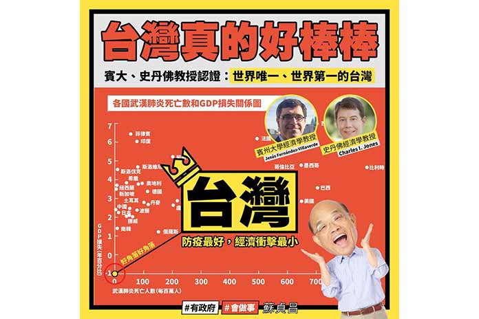 行政院長蘇貞昌昨(6)日在臉書發文表示,臺灣防疫成績,聽說有了新綽號,叫做「角落生物」,依據美國賓州大學經濟學美國賓州大學經濟學教授韋拉維德(Jesús Fernández-Villaverde)和史丹福大學商學院教授瓊斯(Charles I. Jones),月前發表了《COVID-19和總體經濟後果:進度報告》,綜觀全球主要國家的經濟數據,染疫死亡人數,臺灣是世界上的「離群值」,也是唯一在疫情中維持經濟正成長的國家。
