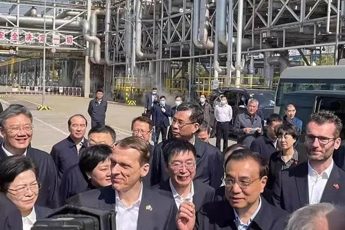 *中國總理李克強於3月26日在江蘇視察為耐吉Nike、阿迪達Adidas等提供原料的中德合資企業巴斯夫BASF廠區。(圖片取材自社群媒體推特Twitter)