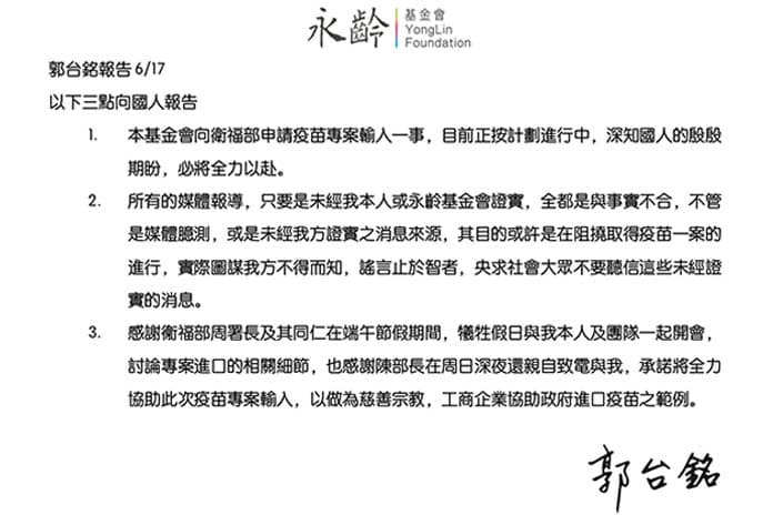 灣鴻海及永齡基金會創辦人郭台銘於6月16日周三深夜在臉書FaceBook貼文表示,向臺灣衛福部申請專案輸入輝瑞疫苗的事,目前正按計畫進行中,將全力以赴。