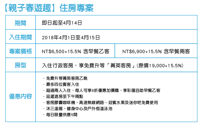 春意盎然的四月,代表大地甦醒的春天已悄悄地到來,更是出外郊遊的好時機!想體驗天倫之樂時光,台北美福大飯店推出一系列闔家同歡的主題住房專案。即日起至4月14日的「親子春遊趣」住房專案,指定期間預訂的賓客可享客房免費升等及延遲退房(至14:00)的專屬優惠,每日充足睡眠後所帶來的充沛活力,一日的美好即刻啟程;入住房客如有4歲(含)以下的孩童隨行,還可獲贈迪士尼主題精美禮品。喜愛看3D電影的消費者不可錯過即日起至9月30日推出的「3D瘋電影」住房專案,入住萬元頂級客房隨興地享受電影時光,每房提供3D電影DVD一片及爆米花,同時依房客人數附贈美麗華電影票券,盡興體驗電影帶來的視覺感官極致享受。另外,即日起至6月15日推出的「夢想家」住房專案,提供寶貝們一個寓教於樂的難忘假期,「Babyboss職業體驗營」提供多達70個職業的角色體驗,藉此挖掘孩子內在的興趣與潛力。4月4日兒童節當天,更邀請了汽球先生於各餐廳提供造型汽球表演,讓小朋友快樂度過專屬節日。洽詢電話02-7722-3399轉訂房。