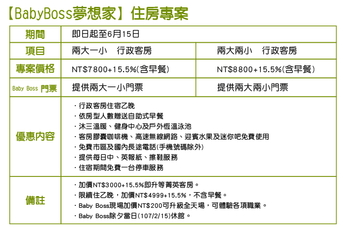 台北美福大飯店攜手成立十週年的BabyBoss職業體驗任意城,即日起至6月15日推出「夢想家」親子住房,BabyBoss職業體驗任意城設置有迷你街道、店舖、公園及建築等50個場館,提供3-12歲體驗工作的意義與樂趣,近70種職業可供選擇,透過「工作」獲得「酬勞」,讓孩子們從玩樂中學習,發掘興趣與潛力,從小建立正確的價值觀。總價值超過NT$18,543的親子專案,兩大一小溫馨入住專案價NT$7,800+15.5%、兩大兩小熱鬧共宿專案價NT$8,800+15.5%,每房提供彩匯活力自助早餐,父母入場門票(價值NT$1,000)及寶貝職業體驗一次(價值NT$900),想要一次玩個夠,現場加價NT$200即可升級體驗各項職業,專案亦提供有續住優惠每房NT$4,999+15.5%(限續住一晚,不含早餐)。