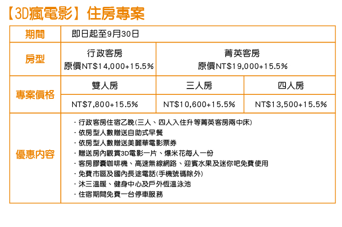 3D電影熱潮持續發燒,身為3D電影迷的你,想體驗臨場震撼的聲光效果,如今又多了一項新選擇。台北美福大飯店即日起至9月30日推出「3D瘋電影」住房專案,雙人住宿每房NT$7,800+15.5%,可入住15坪高雅寬敞的行政客房(原價NT$16,170),亦可選擇三人房或四人房入住。每房依人數提供3D眼鏡一副及附贈欣賞電影必備的爆米花一份,並於Check-in時於櫃檯挑選喜愛的3D電影DVD於房內悠閒地觀賞電影(DVD非贈品)。同時每間房均備有55吋Sony 3D Smart電視、高音質音響及互動式影音系統,讓賓客享受電影時,宛如身歷其境,盡情享受電影帶來的感官刺激。翌日提供彩匯自助餐廳豐盛的中、西式早餐,依入住人數每房再贈送美麗華電影票劵,輕鬆散步約8分鐘即可到近在咫尺的美麗華影城觀看新院線片,讓喜愛看電影的你直呼過癮。